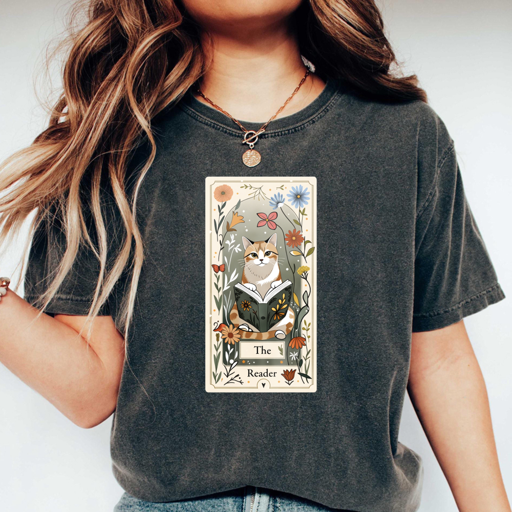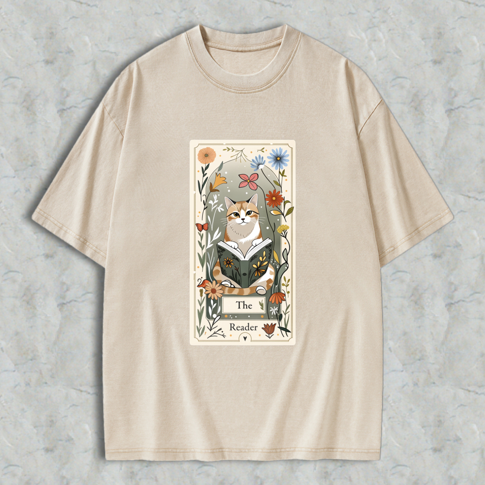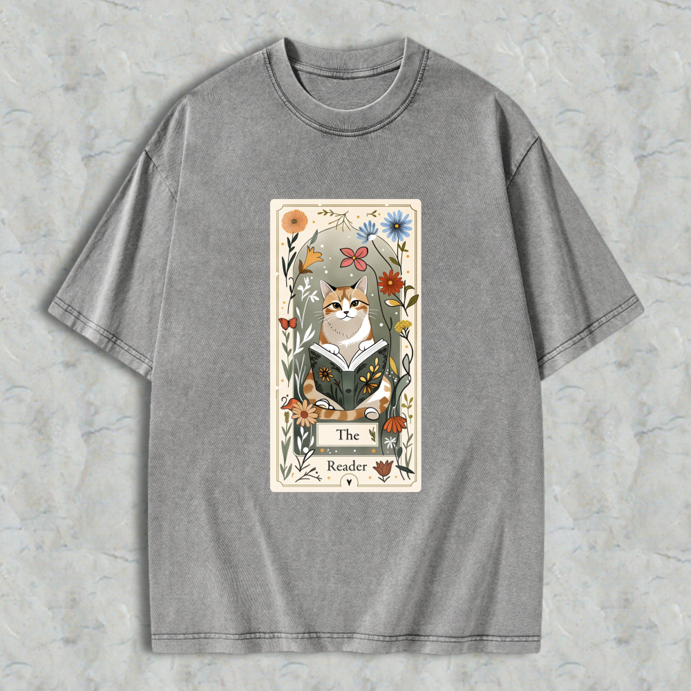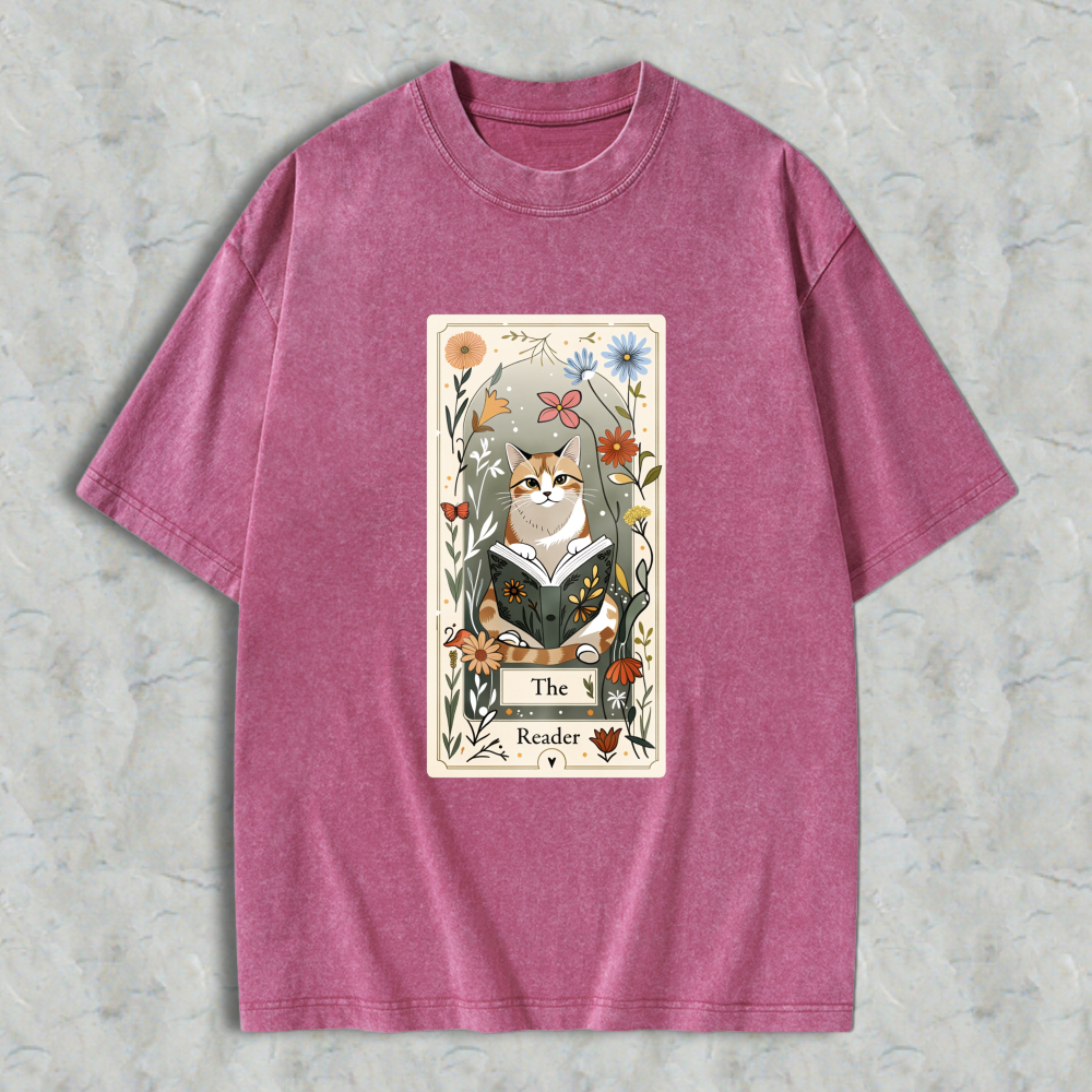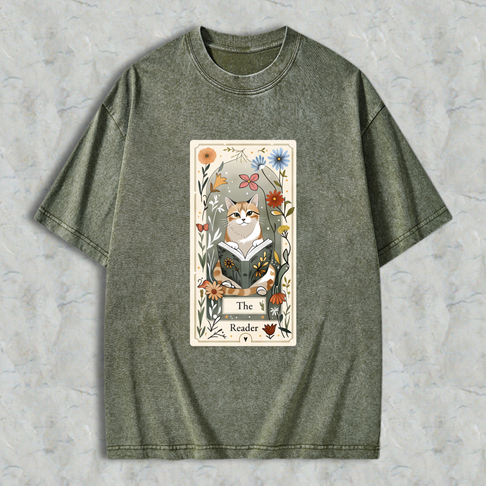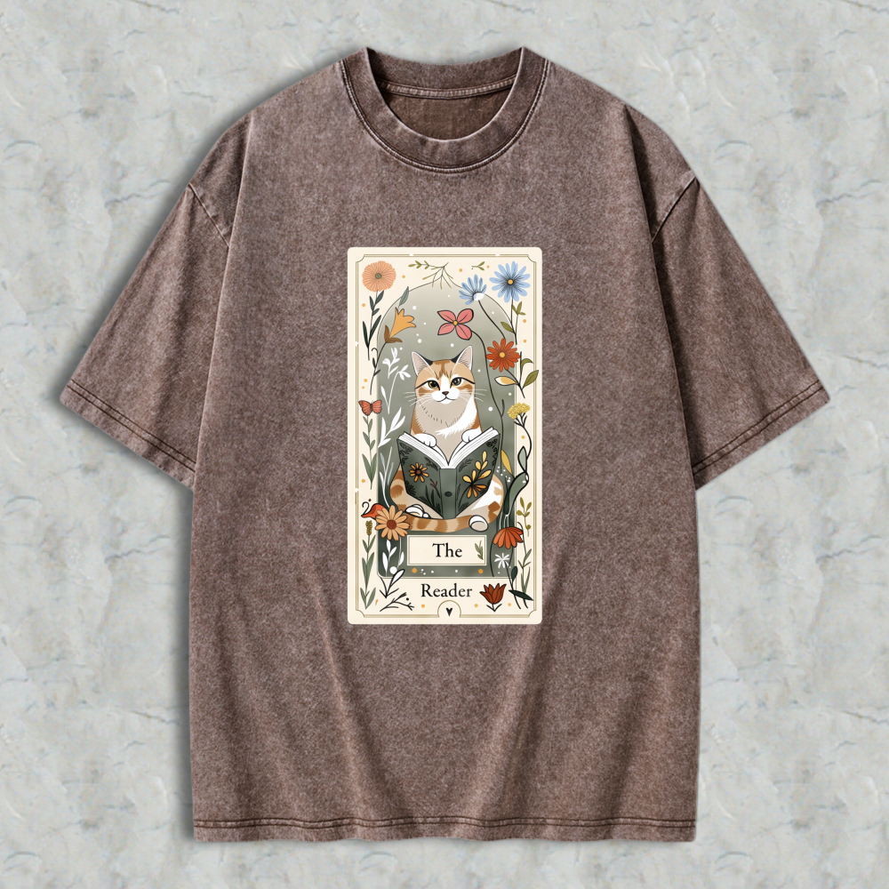 Cat Reading Book Floral Frame The Reader Unisex Washed T-shirt