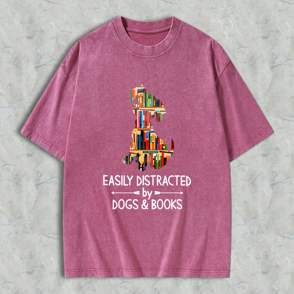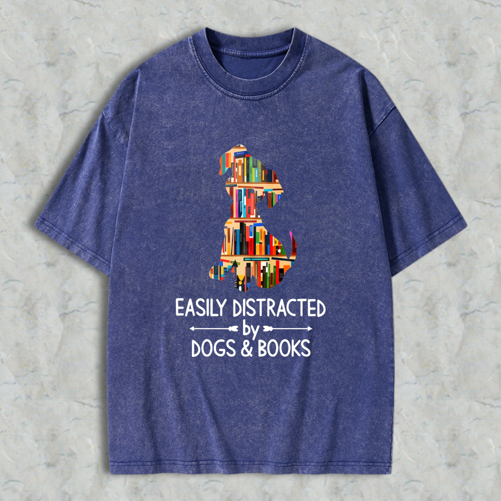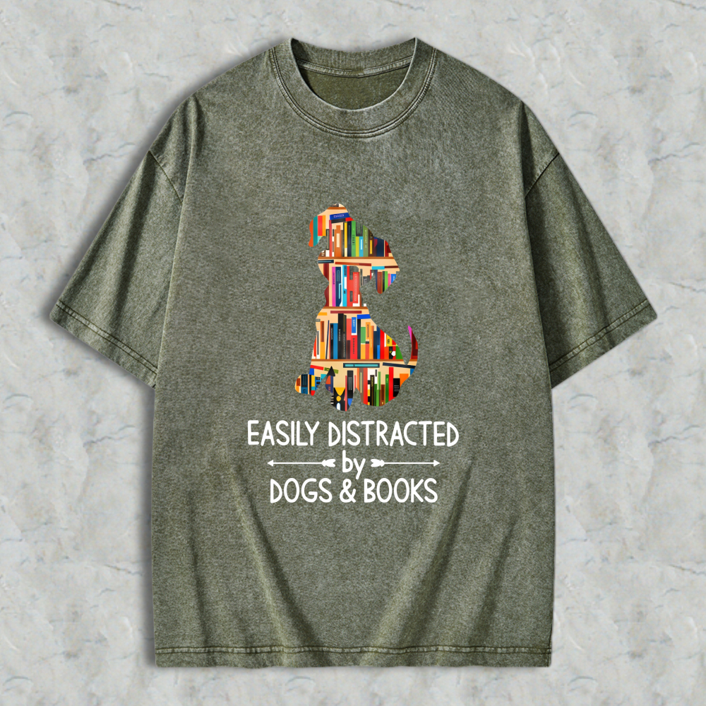 Dog And Books Silhouette Design Easily Distracted By Dogs And Books Unisex Washed T-shirt