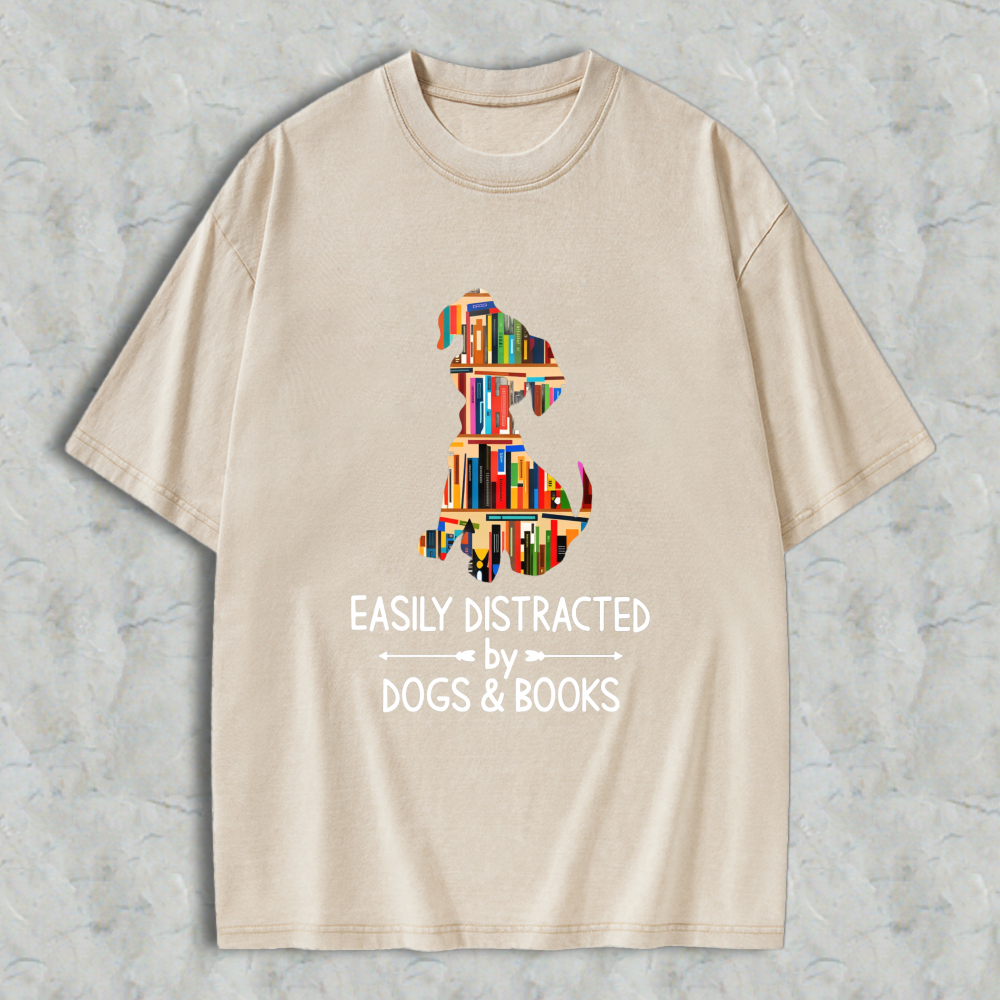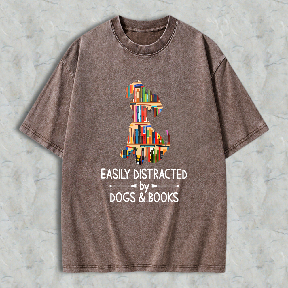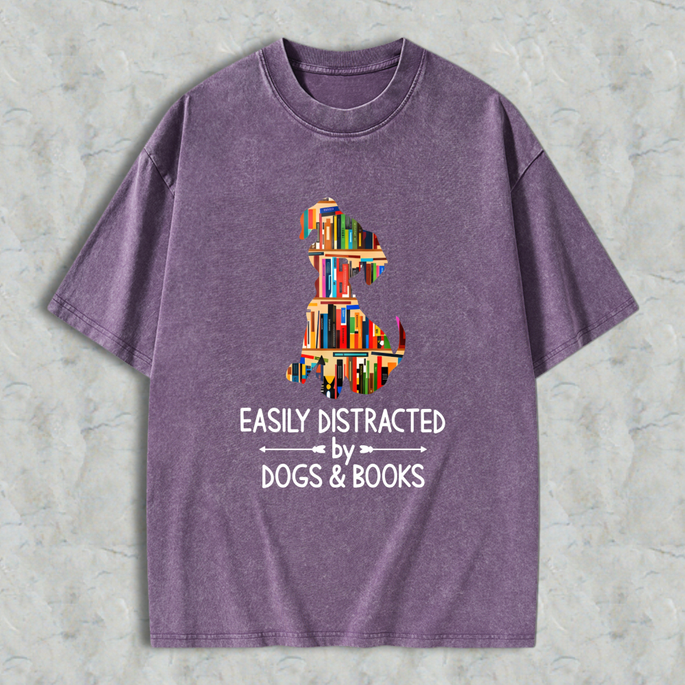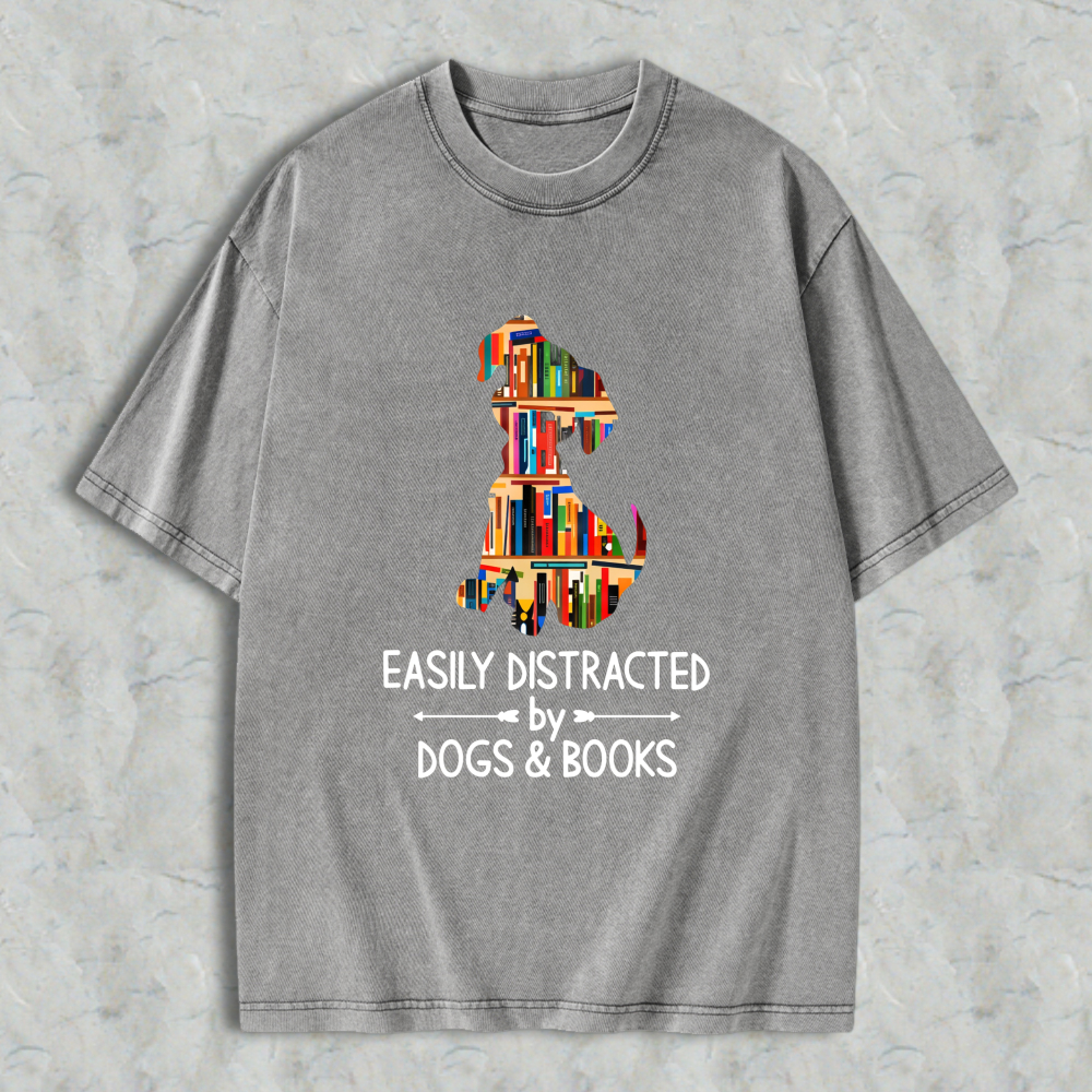 Dog And Books Silhouette Design Easily Distracted By Dogs And Books Unisex Washed T-shirt